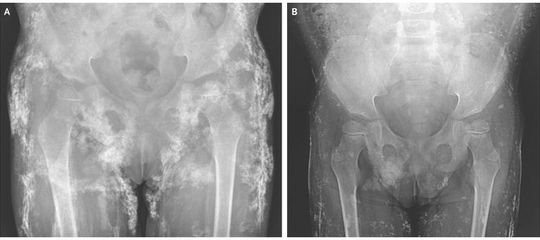 A 4-year-old girl with juvenile dermatomyositis was brought to the rheumatology clinic with a rash and limb weakness. She had had continuous disease activity without remission despite receiving treatment with multiple medications, including glucocorticoids, intravenous immune globulin, methotrexate, and cyclosporine, over a period of 3 years at another hospital. On physical examination, the patient had erythematous changes to the skin overlying the finger, knee, and elbow joints (findings consistent with Gottron’s sign), heliotrope rash around the eyes, proximal muscle weakness in the arms and legs, and diffuse, palpable subcutaneous nodules. A radiograph of the pelvis showed extensive calcification (Panel A). Magnetic resonance imaging of the thighs revealed muscle inflammation and calcinosis. The results of laboratory testing showed strong anti–nuclear matrix protein 2 (anti–NXP-2) autoantibody positivity, a finding associated with calcinosis in juvenile dermatomyositis. Given the patient’s refractory juvenile dermatomyositis and severe calcinosis, treatment with infliximab, thalidomide, and aluminum hydroxide was initiated. Two months after treatment, the patient had improved muscle strength and fading of the rash. At 9 months of treatment, a repeat radiograph showed that the calcinosis had decreased (Panel B).