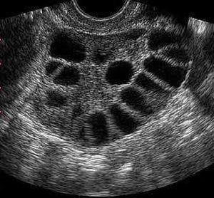 Hints-Showing USG of Ovary of an unmarried women of reproductive age group.She has a history of dysmenorrhoea with acne on face and hirsutism.