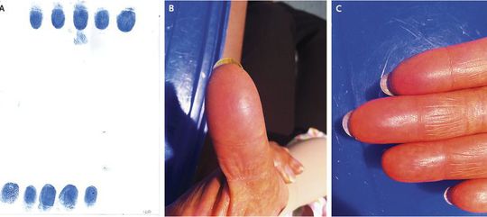 A 65-year-old woman with stage IV breast cancer presented after being denied authorization to perform a banking transaction because her fingerprints were unrecognizable (Panel A). For 3 months, she had undergone treatment for triple-negative breast cancer (a tumor characterized by the lack of expression of estrogen receptor, progesterone receptor, and human epidermal growth factor receptor type 2 [HER2]) with capecitabine and bevacizumab. During the first cycle, grade 1 of the hand–foot syndrome (palmar–plantar erythrodysesthesia) developed and was successfully treated with topical agents. The hand–foot syndrome is a side effect of certain chemotherapeutic agents that is characterized by redness, swelling, and pain on the palms of the hands or soles of the feet. After the third cycle of chemotherapy, the symptoms worsened, with limitation of self-care activities. Positron-emission tomography–computed tomography revealed a 50% reduction in metabolic activity of the lung metastases; capecitabine administration was delayed and subsequently continued at a reduced dose. The patient had no further acute toxic effects, but the fingerprints of her thumb (Panel B) and fingers (Panel C) were erased. We provided her with a letter explaining that the chemotherapy was responsible for her lack of fingerprints.