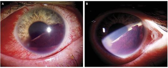 A 33-year-old man who was a pig farmer presented with sudden blurred vision, pain, redness, and photophobia in both eyes. He had a 10-day history of persistent fever (temperature, 39.4 C°), malaise, and myalgia. Ophthalmologic examination revealed bilateral iridocyclitis (anterior uveitis). Local treatment (prednisolone eyedrops and ointment and cyclopentolate eyedrops) alleviated the pain and photophobia overnight, but the next morning he had hyphema in his left eye (Panel A shows a view with the light-source reflection at the 3 o’clock position, and Panel B at the 9 o’clock position illuminating a section of the anterior chamber). Laboratory testing revealed a γ-glutamyltransferase level of 129 U per liter (normal value, <55), an alanine aminotransferase level of 49 U per liter (normal value, <45), and a white-cell count of 11,700 per cubic millimeter (normal range, 4400 to 11,300). Clinical and laboratory findings suggested a diagnosis of leptospirosis. Serologic tests revealed IgM and IgG antibodies against Leptospira interrogans serovar serjoe. Hyphema is usually caused by ocular trauma, but in rare cases, it can be a result of infection. With continued local treatment and the addition of systemic treatment with amoxicillin, the patient’s symptoms abated and his laboratory values and vision returned to normal within 2 weeks. The hyphema and eye redness resolved completely 1 month after their appearance.