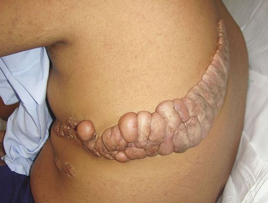 A 24-year-old man underwent thoracic surgery for pulmonary hydatid disease, and 8 weeks later, asymptomatic, tumorlike, cutaneous lesions developed over the incision site. The patient was receiving albendazole as an adjunct therapy. A clinical diagnosis of keloid was made. Keloids typically occur in response to dermal injuries such as surgical wounds, lacerations, burns, or inflammatory skin conditions. Because recurrence is common, surgical removal is generally not recommended; treatments with glucocorticoid injections, laser therapy, or radiotherapy may be tried but are usually associated with a poor response. Given the large size of the lesion in this patient, surgical excision was performed, with an immediate infiltration of glucocorticoids. There was no recurrence 1 month after surgery, and the patient was lost to further follow-up.