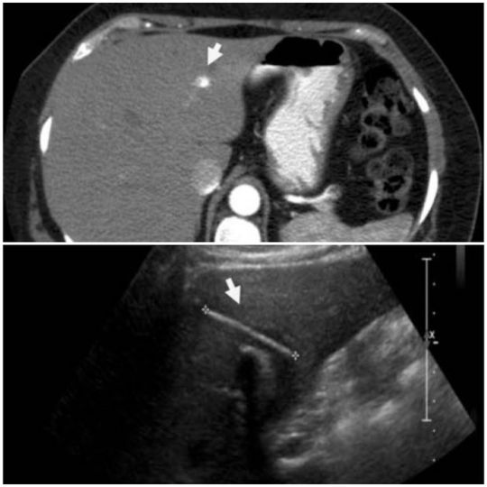 A 45-year-old woman was admitted to the emergency department for recurrent episodes of epigastric pain associated with fever (38.9°C), nausea, vomiting and hypotension. She was on parenteral broad-spectrum antibiotic for suspected intra-abdominal infection. A contrast CT of abdomen confirmed the presence of an elongated structure across the left lateral hepatic segments with abscess in the cavity. The patient was scheduled for an elective exploratory laparoscopy and possible extraction of the foreign body. At the time of surgery, she was found to have inflammation and adhesions between the omentum and the gallbladder. A laparoscopic cholecystectomy was performed. After the 6 months from her surgery, the patient continues to feel well and she denies the recurrence of any of her pre-operative symptoms.
