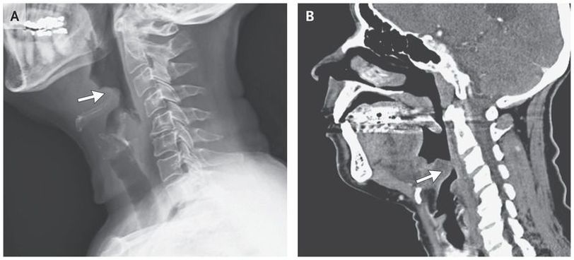A previously healthy 65-year-old woman presented to the emergency department with a 7-day history of throat pain, difficulty swallowing, muffled voice, and subjective fevers. On presentation, she was afebrile and hemodynamically stable with normal oxygen saturation (blood pressure, 140/86 mm Hg; oxygen saturation, 98% while the patient was breathing ambient air). Physical examination revealed mild tenderness and swelling in the anterior neck, without cervical lymphadenopathy or drooling. Lateral soft-tissue radiography of the neck showed the “thumb sign” (Panel A, arrow), indicating a swollen epiglottis, suggestive of epiglottitis. Computed tomography of the neck revealed substantial swelling and edema of the epiglottis (Panel B, arrow), the base of the tongue, and the lingual tonsil. Indirect laryngoscopy revealed erythema and inflammation of the epiglottis and the base of the tongue, with clinically significant hypertrophy of the lingual tonsil and phlegm in the throat. Ceftriaxone and dexamethasone were initiated, owing to the risk of airway compromise. The patient was monitored closely in the hospital for 48 hours. Blood cultures remained negative. The patient’s symptoms improved, and within 3 days after presentation, she was able to consume an oral diet. She was discharged home to complete 1 additional week of antimicrobial treatment with oral cefuroxime.