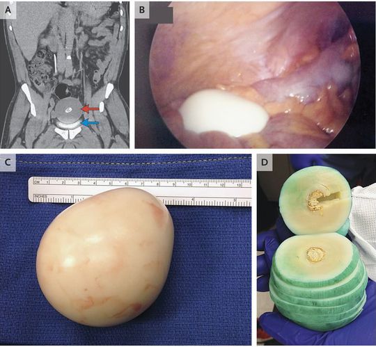 A 62-year-old man presented for evaluation of a history of urinary frequency of more than 20 years. The physical examination and laboratory findings were unremarkable. Computed tomography of the abdomen and pelvis revealed an 8.5-cm midline mass with central calcification (Panel A, red arrow) superior to and compressing the bladder (Panel A, blue arrow). Laparoscopy revealed a free-floating, smooth, firm, rubbery mass measuring 10 cm by 9.5 cm by 7.5 cm and weighing 220 g (Panels B and C). The sectioned specimen included several layers; green ink was used to delineate section margins (Panel D). Histologically, the mass contained predominantly acellular, laminated, fibrous tissue; centrally, the specimen contained proteinaceous material with fibrinoid necrosis, surrounded by a ring of calcification. The findings were consistent with a peritoneal loose body, a formation that is thought to result from torsed, infarcted, and detached epiploic appendages that transform into fibrotic masses. Such masses are often asymptomatic when they are small, but they can be large enough to cause extrinsic compression that is associated with bowel obstruction, urinary retention, or (as in this patient) urinary frequency. The patient's urinary frequency resolved immediately after the surgical removal of the mass.