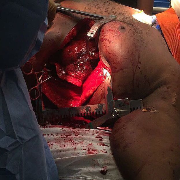 EMS stated that the 40 year old male ran out of fuel in his SUV, pulled over got out of his vehicle and was struck on the side of the road by another vehicle at unknown speed. He survived the life-saving intervention. Thoracotomy is a surgical opening of the chest cavity, or thorax, that is performed upon the anterior chest wall. It is performed by surgeons to gain access to the thoracic organs, most commonly the heart, the lungs, or the esophagus, or for access to the thoracic aorta or the anterior spine (the latter necessary in case of tumors in the spine). A resuscitative or emergency thoracotomy may be performed to resuscitate a patient who is near death as a result of a chest injury. It provides access to the chest cavity to control injury-related bleeding from the heart, cardiac compressions to restore a normal heart rhythm, or to relieve pressure on the heart caused by cardiac tamponade, a medical emergency that requires urgent drainage of the accumulated pericardial fluid.