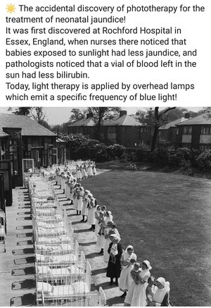 Beautiful picture showing nurses taking newborns under open sky in day light.Now we use specific wavelength of Blue light to convert Bilirubin to Lumirubin, which is readily excreted by urine.It is now called PHOTOTHERAPY.