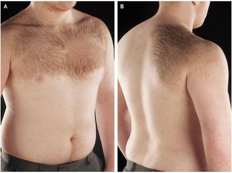 A healthy 15-year-old boy presented to the dermatology clinic with an area of pigmentation on his chest. He reported that it had been present since early childhood but that during puberty it had become darker and developed hair. He had no family history of similar cutaneous findings. Examination revealed a well-demarcated tan-colored patch covered with coarse dark hairs, spanning his upper chest and extending onto the right shoulder and back (Panels A and B). Physical examination was otherwise unremarkable. A clinical diagnosis of Becker's nevus was made. Becker's nevus is a benign nevoid hypermelanosis, characterized by a circumscribed hyperpigmented patch with an irregular edge. Overlying hypertrichosis frequently develops several years later. The lesion typically develops on the upper trunk, shoulders, or upper arms of adolescent males. Becker's nevi are generally asymptomatic, and no treatment is usually required.