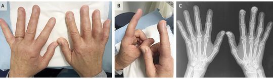 A 77-year-old right-handed woman with limited cutaneous systemic sclerosis presented to the rheumatology clinic with a 2-year history of slowly progressive, painful swelling of her fingertips. On physical examination, the patient had telangiectases on her face and thorax and thickening of the skin on her right hand, both forearms, and face, as well as soft-tissue swelling of the tips of the fingers of both hands (Panels A and B). Findings on capillaroscopy were notable for disorganization of capillaries, avascular areas, and the presence of enlarged capillaries. A radiograph of the hands showed calcifications near the distal phalanx of the first, second, and third fingers of the right hand and the first finger of the left hand (Panel C), which were consistent with calcinosis, a manifestation of limited cutaneous systemic sclerosis. These calcium deposits may grow, ulcerate, and become infected. Despite trials of multiple medications, the patient had progressive pain and numbness in her fingers, with increasing difficulty handling objects, and was referred for surgical evaluation regarding excision of the lesions.