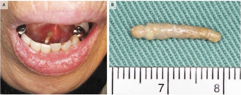 An otherwise healthy 77-year-old woman was referred to our clinic with a 6-month history of dull pain on the right side of the tongue. Intraoral examination revealed a normal tongue. However, there was a visible sialolith emerging from Wharton's duct, with marked redness and swelling of the right sublingual caruncle (Panel A). The sialolith was easily removed with the use of tweezers, with a subsequent discharge of pus and normal saliva. The calcified stone measured approximately 1.6 cm in length (Panel B). At follow-up 1 week later, the patient was doing well, with normal salivary flow and without any residual tongue pain.