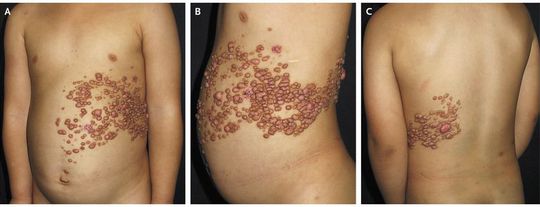 A 4-year-old girl presented for evaluation of cutaneous nodules that had been present on the left side of her trunk since birth. She had no history of seizures or developmental delay, and there was no family history of similar cutaneous findings. Physical examination revealed numerous soft, nontender papules and nodules between 2 and 12 mm in diameter, distributed across the left upper abdomen (Panel A) and wrapping around to the left back (Panels B and C). The remainder of the physical examination was unremarkable; axillary freckles, café au lait macules, and Lisch nodules were not observed. Results of a biopsy of a nodule were consistent with a neurofibroma. The patient received a diagnosis of segmental neurofibromatosis, a variant of neurofibromatosis characterized by neurofibromas or café au lait macules (or both) that are confined to one body segment. Segmental neurofibromatosis results from a postzygotic mutation in the NF1 gene, leading to somatic mosaicism. The patient was scheduled for annual follow-up for surveillance of the nodules and any conditions that may be associated with neurofibromatosis. Because she has remained free from systemic complications of neurofibromatosis since birth, no specific treatment has been pursued. Her parents were offered genetic counseling on her behalf.