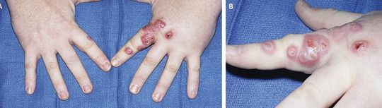 A 34-year-old farmer presented to our emergency department with a painful rash with purulent-appearing papules on his hands (Panels A and B). The rash had been worsening over the previous 21/2 weeks. The physical examination was otherwise unremarkable. The patient manages livestock on his farm. The rash began a few days after a sheep bit his left hand while being bolus-fed. The patient was experienced in sheep care and reported that multiple animals on his farm had “sore mouth disease.” He did not wear gloves while performing the feeds. Initial differential diagnosis included herpetic whitlow, cutaneous anthrax, methicillin-resistant Staphylococcus aureus infection, and poxvirus infection. Lesional swabs were sent to the Centers for Disease Control and Prevention, where polymerase-chain-reaction assay confirmed the suspected diagnosis of contagious ecthyma, a zoonotic infection caused by the orf virus. This viral infection is typically self-limited in immunocompetent patients. The patient was treated conservatively with routine wound care and antibiotic agents for possible bacterial superinfection. His lesions resolved completely over a period of 3 weeks. To prevent recurrent infection, the patient was advised to use gloves when he handled the animals or any potentially contaminated equipment.