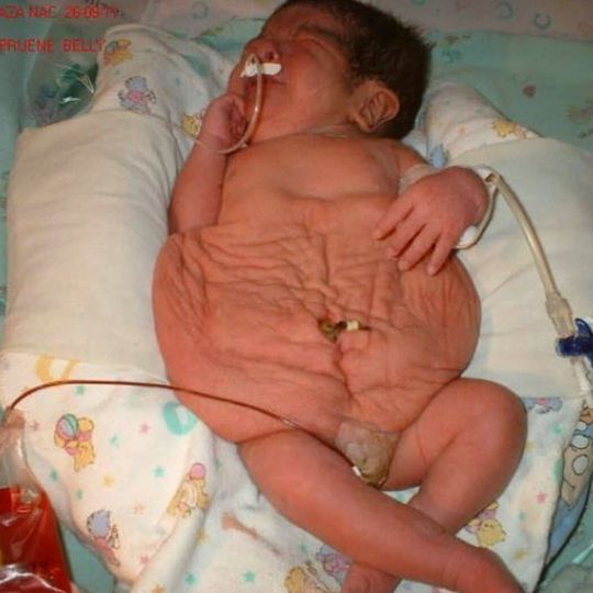 This is a really unfortunate case of a syndrome called Prune Belly syndrome. - Prune belly syndrome is a rare, genetic birth defect affecting about 1 in 40,000 births. About 97% of those affected are male. Prune belly syndrome is a congenital disorder of the urinary system, characterized by a triad of symptoms. The syndrome is named for the mass of wrinkled skin that is often (but not always) present on the abdomen of those with the disorder.