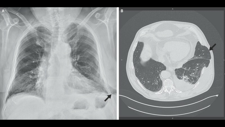 A 67-year-old man was admitted to the emergency department with a 10-day history of pain in the left side of the chest that had begun after an episode of severe coughing. He described persistent pain, without dyspnea, that was unrelieved by analgesic agents. He also noted swelling on the lower left side of the chest. The patient had a history of smoking, hypertension, and chronic obstructive pulmonary disease that required treatment with continuous positive airway pressure. There was no history of chest trauma or surgery involving the chest. Physical examination revealed thoracic asymmetry, with a soft, reducible mass corresponding to the region of swelling that was painful on palpation. The mass increased in size with inspiration and decreased in size with expiration. A radiograph of the chest showed extension of lung parenchyma beyond the rib cage laterally at the base of the left lung (Panel A, arrow). Computed tomography of the chest revealed lung herniation through a left lower intercostal space laterally, as well as a moderate pleural effusion on the left side (Panel B, arrow). The patient underwent successful surgical repair of the hernia.