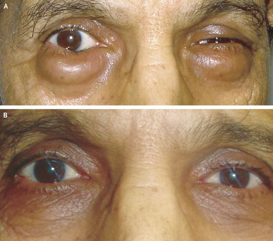 A 65-year-old man presented with a 2-month history of painless swelling of the lower eyelids bilaterally. He had had a permanent pacemaker inserted 4 years previously for the treatment of third-degree heart block. On physical examination, bilateral palpebral edema and palpable masses were identified (Panel A). Computed tomography (CT) of the head showed enlargement of both lower eyelids with no associated cervical lymphadenopathy. Excision biopsy of the palpebral tumor revealed mucosa-associated lymphoid tissue (MALT) lymphoma. Comprehensive physical examination revealed no other lesions. Localized MALT lymphoma of the lower eyelids was diagnosed. The patient was treated with radiation therapy, delivered in five daily fractions of 3.2 Gy, and had a complete response after the completion of radiation therapy (Panel B). At 18 months of follow-up, ophthalmologic examination and CT revealed no relapse of lymphoma at a local or distant site.