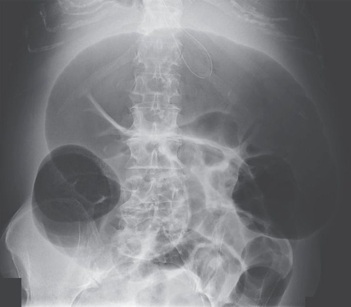 A 70-year-old woman with end-stage liver disease from hepatitis C was admitted to the hospital for confusion. Portosystemic encephalopathy was diagnosed, and the patient was treated with 20 g of lactulose every 6 hours. A few days after admission, abdominal pain with marked abdominal distention developed. There was no fever or leukocytosis. Abdominal radiography showed a distended, air-filled colon to the level of the splenic flexure, with the cecum and transverse colon measuring 11 cm and 14 cm, respectively. Subsequent abdominal computed tomography showed marked distention of the proximal colon with an abrupt transition to a decompressed colon at the level of the proximal descending colon, with no evidence of an obstructing lesion. A diagnosis of acute colonic pseudo-obstruction, or Ogilvie's syndrome, was made. She was initially treated conservatively with the administration of intravenous fluids and the use of nasogastric and rectal tubes. The use of neostigmine was contraindicated, given the acute renal failure. When her abdominal discomfort worsened, colonoscopic decompression was performed, resulting in marked improvement. Acute colonic pseudo-obstruction is characterized by massively dilated large-bowel segments in the absence of mechanical obstruction and can be seen in a wide variety of medical and surgical illnesses.