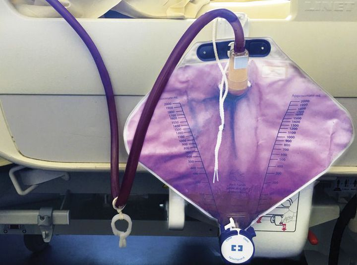 A 70-year-old woman had a urinary catheter placed during a hospitalization for aphasia and hemiplegia after an acute stroke. Ten days after catheterization, her urine appeared purple. Urinalysis showed leukocytes but no nitrites, and the pH was 8. A urine culture grew Klebsiella pneumoniae. The purple discoloration is thought to occur as a result of a chemical reaction facilitated by certain bacteria in alkaline environments. Dietary tryptophan is converted to indole within the gut, absorbed into the circulation, and metabolized by the liver to form indoxyl sulfate. When excreted in the urine, indoxyl sulfate can be broken down by bacterial enzymes to form indigo and indirubin, which are blue and red, respectively, creating the color purple when combined. This reaction is known to occur in the presence of several other bacteria, including Pseudomonas aeruginosa, Providencia stuartii, Escherichia coli, and enterococcus species. Since the patient had no clinical signs consistent with infection, no antibiotics were administered, but she did receive intravenous hydration. The purple discoloration resolved over 4 days, and the urinary pH returned to a normal level, but the patient remained hemiplegic and aphasic and was admitted to a long-term care facility.