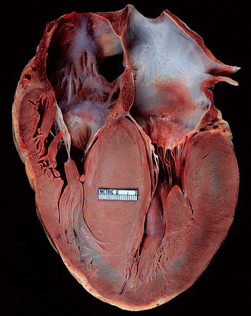That septum definitely looks thick! Hypertrophic cardiomyopathy is a condition in which the myocardium becomes thickened, making the heart muscle stiff, especially of the septum and ventricles (lower heart chambers), which is seen very clearly in this picture. The pathophysiology behind it is that the sarcomeres (contractile elements) in the heart replicate causing heart muscle cells to increase in size, which results in the thickening of the heart muscle. In addition, the normal alignment of muscle cells is disrupted, a phenomenon known as myocardial disarray. The average left ventricular wall thickness in normal adults is 1.1 cm, but there are exceptions. Trained athletes have hearts that have left ventricular mass up to 60% greater than untrained subjects, with an average left ventricular wall thickness of 1.3 cm. The most common cause is hypertension. As many as 1/3 of patients show left ventricular hypertrophy of any degree along with hypertension. Symptoms are quite variable and range from no symptoms, to the development of heart failure, to the occurrence of sudden cardiac death. Symptoms include dyspnea (shortness of breath) due to stiffening and decreased blood filling of the ventricles, exertional chest pain (angina) due to reduced or restricted blood flow to the coronary arteries, uncomfortable awareness of a fluttering or pounding heart beat (palpitations) due to the ischemia to the heart muscle, disruption of the electrical system running through the abnormal heart muscle, lightheadedness, fatigue, fainting (called syncope) and sudden cardiac death. Treatment goals are to minimize diastolic dysfunction, reducing LV outflow tract obstruction, optimizing heart failure management, maintaining normal sinus rhythm, rate control and anticoagulation in the presence of atrial fibrillation, and implantation of an automatic implantable cardiac defibrillator in those patients who survive sudden cardiac death.