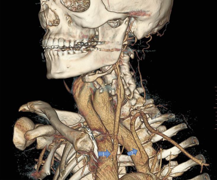 A healthy 23-year-old woman was referred to our cardiology clinic for evaluation of a murmur and an increasingly pulsatile neck mass (Video), first noted 2 years before presentation. Physical examination revealed a prominent pulsation in the right side of the neck and an early diastolic murmur, grade 2/6, in the aortic position. Her blood pressure was 134/78 mm Hg in the right arm and 122/72 mm Hg in the left arm. No radial–radial or radial–femoral delay was appreciated. Transthoracic echocardiography revealed a bicuspid aortic valve with mild aortic regurgitation. Computed tomographic angiography (reconstructed image) revealed a cervical aortic arch with the left common carotid artery arising from the ascending portion (arrow 1) and the left subclavian artery arising from the descending aorta (arrow 2). Embryologically, this anomaly has been considered to result either from regression of the fourth aortic arch (with persistence of the third) or from the failure of normal caudal descent of the aortic arch system. The patient underwent reconstruction of the cervical arch, with adjustment to an intrathoracic position. She was doing well at follow-up 18 months after surgery.