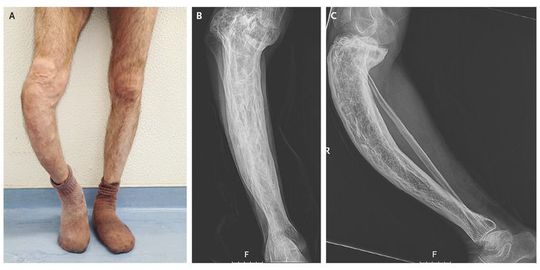 A 57-year-old man presented with long-standing, painful deformation of the right tibia. He reported increased volume of the right leg since late adolescence and three low-impact fractures in the fourth decade of life. He was treated 15 years before presentation with calcitonin for 6 months, without symptomatic relief. Physical examination revealed a prominent saber-like tibia and superficial venous circulation related to chronic venous insufficiency (Panel A). Radiographs showed cortical thickening, trabecular enlargement, and bowing of the tibia (Panel B shows the anteroposterior view and Panel C the lateral view). Levels of bone turnover markers were increased, including an alkaline phosphatase level of 345 U per liter (normal range, 45 to 129), an N-terminal propeptide of type I procollagen (P1NP) level of 506.3 ng per milliliter (normal value, <36.4), and a level of the β-isomer of the C-terminal telopeptide of type I collagen (β-CTX) of 1.38 ng per milliliter (normal value, <0.30). These findings show the clinical sequelae of prolonged early-onset Paget's disease of bone. Zoledronate at a single dose of 5 mg was prescribed owing to the increased metabolic activity in a weight-bearing location. Near-normalization of the alkaline phosphatase level (69 U per liter), the P1NP level (40.6 ng per milliliter), and the β-CTX level (0.34 ng per milliliter) was seen after 1 year, with symptomatic improvement.