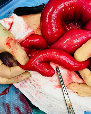 Meckel's diverticulum is the most common congenital defect of the small bowel, an outpouching or bulge in the lower part of the small intestine. The bulge is congenital and is a leftover of the umbilical cord. it is caused by an incomplete obliteration of the vitelline duct (ie, omphalomesenteric duct). The duct undergoes progressive narrowing and should disappear by 7 weeks' gestation. When the duct fails to fully obliterate, different types of vitelline duct anomalies appear, such as this true diverticulum, which contains all three layers of the small intestine. The disorder is typically asymptomatic and clinically presents with painless rectal bleeding. Definitive treatment of complications, such as a bleeding diverticulum, perforation, and obstruction, is a surgical excision of the diverticulum along with the adjacent ileal segment, which may be ulcerated. This can be accomplished through laparoscopy or open surgery. Photo by @drbuckparker