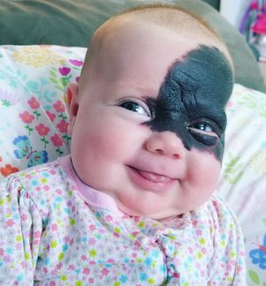 My almost 3 month old daughter. We were quite surprised when she was born. She has a Congenital Melanocytic Nevus. She has had an MRI and no melanocytes were seen! Her pediatric dermatologist is confident that her chances of ever having melanoma are only slightly increased. Her satellites are very, very few so far.