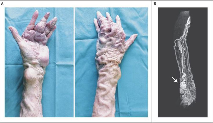 A 77-year-old woman was referred for evaluation of fingertip ulcers. She had arteriovenous malformation of the left arm (Panel A) that had been present since childhood. Physical examination revealed hypertrophy, with a giant arteriovenous malformation involving her fingers, forearm, elbow, and upper arm. The malformation was pulsatile, with dilated veins and arteries, and a palpable thrill. Small ulcerations were noted in the fingertips. There was no indication of cardiac failure. A magnetic resonance angiogram of the elbow, forearm, and hand (Panel B, dorsal view, three-dimensional, maximum-intensity projection) showed enlarged and tortuous arteries and veins, with several sites of aneurysmal dilatation throughout the imaged portion of the limb (Panel B, arrow) and multiple high-flow arteriovenous shunts. Parkes Weber syndrome consists of venous and capillary malformations and high-flow arteriovenous shunts, with overgrowth of the affected limb. Most cases are sporadic, although the syndrome may be inherited. Some cases are caused by mutations in RASA1. The syndrome rarely appears in the arm, particularly with this degree of vascular dilatation, which is presumably the result of lifelong evolution. It is more common for the legs to be affected. The patient did not want surgical treatment, and the ulcers are being managed with compressive therapy and local wound care.