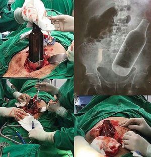 This man presented to the emergency department with profuse rectal bleeding, abdominal pain, and an altered mental status. A foreign body was found on rectal examination but was not visible, took a plain-film radiography of the abdomen and voila - reveals a beer bottle lodged in his rectum. The doctors were not able to manually extract the bottle and had to surgically remove it