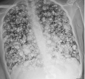 A 21-year-old woman presented to the emergency department with an 8-month history of swelling and pain in the right thigh. MRI of the right leg revealed a large periosteal femoral mass and thrombus in the right femoral vein, for which she received anticoagulation therapy. The patient subsequently experienced dyspnea and pleuritic chest pain, and a chest x-ray was done. What is the likely A-Pulmonary embolism B-Pulmonary sarcoidosis C-Eosinophilic granulomatosis with polyangiitis D-Chondroblastic osteosarcoma E-Miliary tuberculosisdiagnosis?