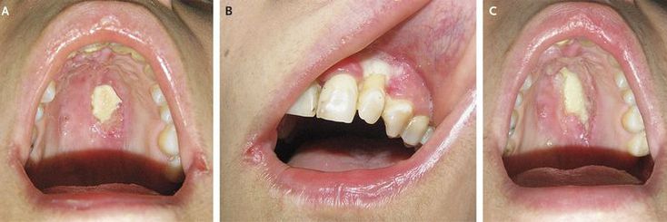 A 34-year-old woman presented with a 3-month history of ulcerated plaques on the palate and gingiva. Physical examination revealed two ulcerated lesions with irregular margins on the hard palate (Panel A) and gingival mucosa (Panel B). The palatal bone and maxillary alveolar process were focally denuded of their mucosal covering. Computed tomography of the paranasal sinuses, nose, and orbit with the use of contrast material revealed no evidence of mass or lymphadenopathy. Nasal endoscopy was normal. Culture of a palatal biopsy specimen was positive for Staphylococcus aureus. Histopathological findings were negative for cancer. The patient began receiving intravenous antibiotic agents and was doing well until day 10, when she presented with fever and intermittent swelling on the left side of her face. Two weeks later, the palatal lesion had enlarged (Panel C), and a second biopsy was performed. Histopathological examination revealed an extranodal natural-killer-cell–T-cell lymphoma, nasal type. This is a non-Hodgkin's lymphoma with extranodal presentation within the upper aerodigestive tract, commonly involving the nasal cavity, nasopharynx, and paranasal sinuses. The patient received radiotherapy and modified SMILE chemotherapy (consisting of asparaginase, methotrexate, ifosfamide, etoposide, and dexamethasone) and underwent autologous bone marrow transplantation. At 8 months, she remains in remission, with no evidence that the lymphoma has recurred.
