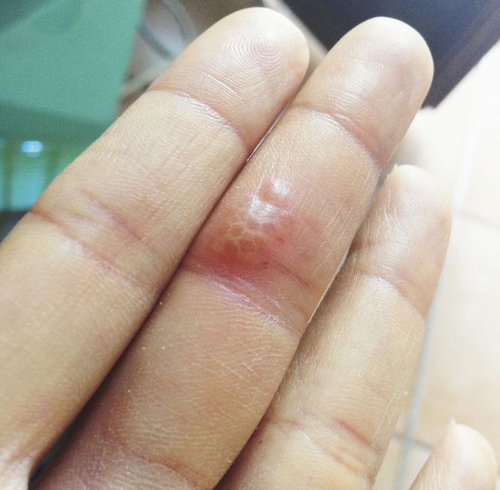 A previously healthy 18-year-old woman presented with a 2-week history of fever, malaise, and a painful left middle finger. Physical examination revealed an area of erythematous, confluent vesicles on the middle phalanx of the finger and associated axillary lymphadenopathy. She was given a clinical diagnosis of superficial skin infection (erysipelas) and was started on a course of oral antibiotics. She returned 1 week later with persistent symptoms. She reported no history of similar oral or genital symptoms. Direct fluorescence antibody testing of vesicular fluid was performed and confirmed the presence of herpes simplex virus type 2 (HSV-2). Her initial constitutional symptoms of fever and malaise, hallmarks of primary HSV-2 infection, indicated that the infection was newly acquired. She received a diagnosis of herpetic whitlow and was treated with a 7-day course of oral acyclovir. At a 1-week follow-up visit, the patient's symptoms had improved. At a 2-year follow-up the patient reported having had several recurrences involving her finger, which required treatment with antiviral medication.