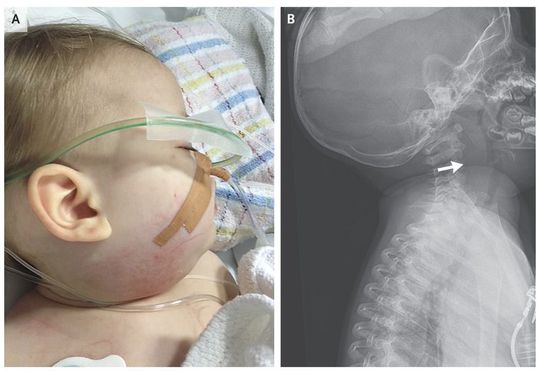 A fully immunized, previously well 11-month-old girl presented with a 4-day history of fever, coryza, and increasingly frequent respiratory grunting. On examination, she was febrile (temperature, 38.2°C), and had tachycardia and hypotension. She also had tachypnea, with mild stridor, and there was a fullness on the right side of her neck that developed on the day of presentation (Panel A). Lateral neck radiography revealed additional prevertebral swelling (Panel B, arrow), and an ultrasound scan showed multiple enlarged lymph nodes but no retropharyngeal abscess. The patient had neutropenia (5100 white cells per cubic millimeter and 2600 neutrophils per cubic millimeter) and an elevated level of C-reactive protein. She was treated with ceftriaxone, but her condition rapidly deteriorated, with progressive neck swelling, bilateral pleural effusions, and hepatosplenomegaly. Acidosis developed, and blood-product transfusions were required. The differential diagnosis included toxic shock syndrome, hemophagocytic lymphohistiocytosis, acute myeloid leukemia, lymphoma, and tumor lysis syndrome. Although blood cultures were negative, group A streptococcus grew on cultures of pleural fluid samples and a biopsy specimen from a cervical lymph node. The development of significant cervical lymphadenopathy concurrently with symptoms of shock appeared to be part of the initial group A streptococcal septic shock syndrome, with subsequent development of pleural effusions and organomegaly. The patient gradually improved, and antibiotics were ceased after 4 weeks, with complete resolution of lymphadenopathy and hepatosplenomegaly.