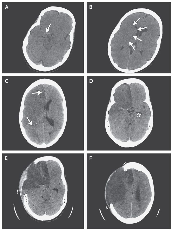 A 47-year-old woman with a history of migraine was admitted to the hospital with acute-onset headache on the left side of her head and mild weakness of her left arm. Computed tomography (CT) of the brain without the use of contrast material was performed 5 hours after symptom onset and showed linear areas of hyperdensity in the first segment of the right middle cerebral artery (Panel A, arrow) and the first segment of the anterior cerebral artery. There were early signs of cerebral edema, including subtle low attenuation with loss of gray–white differentiation and effacement of sulci in both the right middle-cerebral-artery and anterior-cerebral-artery territories (Panel B, arrows). Four hours later, the patient became drowsy, and complete paralysis of the left side developed. A CT scan of the brain 9 hours after symptom onset showed large, nonhemorrhagic infarcts in the middle-cerebral-artery and anterior-cerebral-artery territories, with increased edema, mild right-to-left midline shift (Panel C, arrows), and some trapping of the left lateral ventricle (Panel D, asterisk). A total of 21 hours after symptom onset, the patient underwent decompressive craniectomy of the frontoparietal region (Panels E and F). She had a gradual recovery but died 6 weeks later from pneumonia.