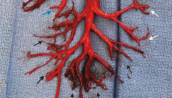 Coughing up blood is an alarming symptom, but it's not particularly rare. Even so, one man in California shocked his doctors when he coughed up an unusual-looking blood clot: It was in the shape of his lung. The 36-year-old man was being treated for a serious heart condition, according to a new report of the case, published Nov. 29 in The New England Journal of Medicine. He had chronic heart failure, which means the heart muscle can't pump enough blood to meet the body's normal demands. His condition was so severe that doctors put him on a machine called a ventricular assist device, which helps the heart pump blood. Because these machines can also increase the risk of blood clots, he was prescribed a blood-thinner medication. However, these medications also increase the risk of bleeding, including coughing up blood. Indeed, the patient had several coughing episodes in which he expelled small amounts of blood, according to the report. But then, during an "extreme bout of coughing," the patient spit out an "intact cast" of the right bronchial tree. In other words, it was a mold (cast) made of clotted blood in the shape of the lung's branched airway passages known as bronchi.