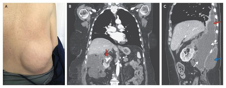 A 65-year-old woman presented to the hospital with a 4-month history of intermittent low-grade fever, asthenia, anorexia, and weight loss. Her medical history was limited to atrophic gastritis treated with intramuscular vitamin B12. Physical examination revealed a large, soft mass protruding from her right flank (Panel A, view from posterior). Blood tests showed a leukocyte count of 17,900 per cubic millimeter (90% neutrophils), a hemoglobin level of 9.8 g per deciliter, a C-reactive protein level of 274 mg per liter, and an erythrocyte sedimentation rate of 104 mm per hour. Blood cultures were negative. Computed tomography of the abdomen with the use of contrast material revealed a large, obstructing calculus in the upper-pole calyx of the right kidney, causing focal atrophy and cortical thinning of the upper pole (Panel B, arrow); there was also a large retroperitoneal abscess (Panel C, white arrows) extending into the chest (Panel C, red arrow) and subcutaneous tissues of the right flank (Panel C, blue arrow). A urine culture was positive for Proteus mirabilis, as was a culture of fluid drained percutaneously from the abscess. A right nephrectomy was performed. Histologic examination revealed an abscess with chronic inflammation and no xanthogranulomatous changes. The patient was doing well 18 months after surgery.