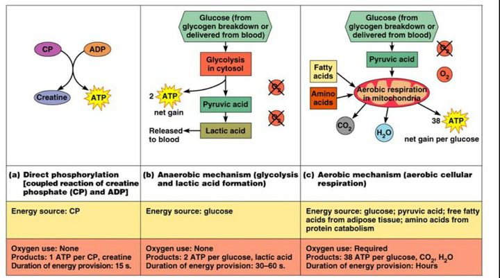 Step1: in the first 2 sec taking ATP from the cytosol Step2: creatinphpsphat is divided in creatin and ATP (here (a)) Step3: Glucose directly from the blood or from the liver (glycogen) (b) Step 4: Glucose, pyruvic acid, free fatty acids from adipose tissue (c)