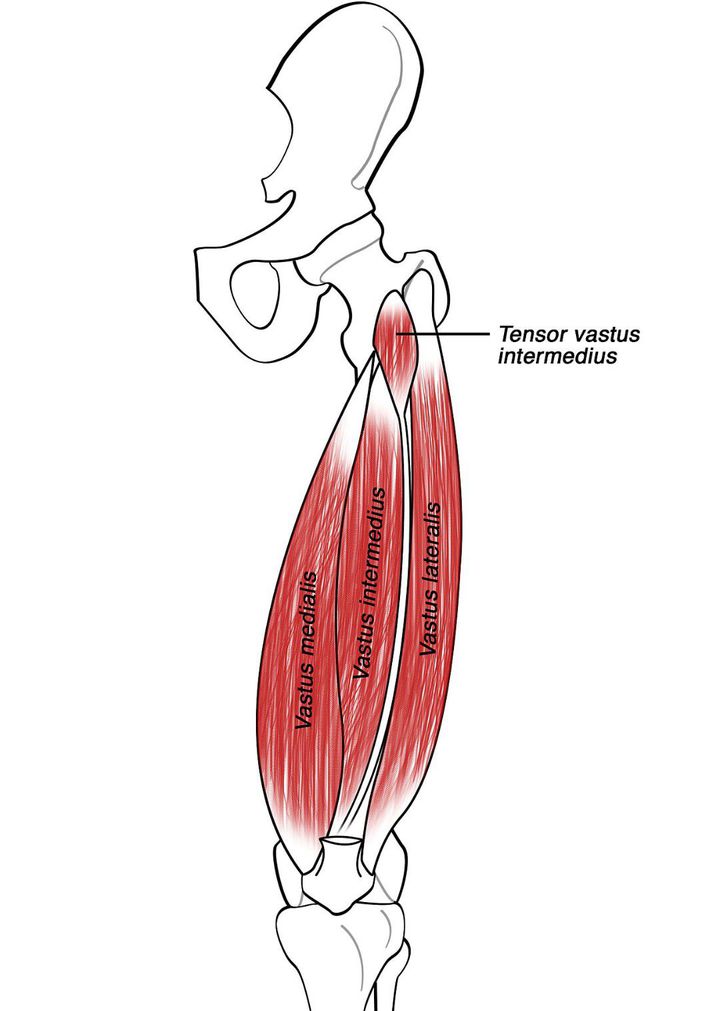 TENSOR VASTUS INTERMEDIUS Muscle in anterior compartment of thigh Lies between vastus intermedius and vastus lateralis (anterior to vastus intermedius but deep to rectus femoris) ORIGIN:anterior part of greater trochanter INSERTION:joins the quadriceps tendon and inserts into medial aspect of patella... It was not described in any textbook!!!
