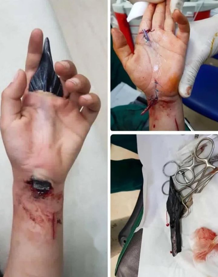 This man was doing some fence work when he slipped and instinctively tried to hold on one of the spearheads, which pierced and got lodged through the palm of his hand. Luckily enough, it missed all the main blood vessels in the hand. The spearhead was removed, wound was thoroughly irrigated and inspected for any signs of tendon/nerve/vessel damage. A drain was then inserted and the wound was sutured together. The patient recovered without complications. Credit: #Argawara Follow us at @Medicalpedia for more!