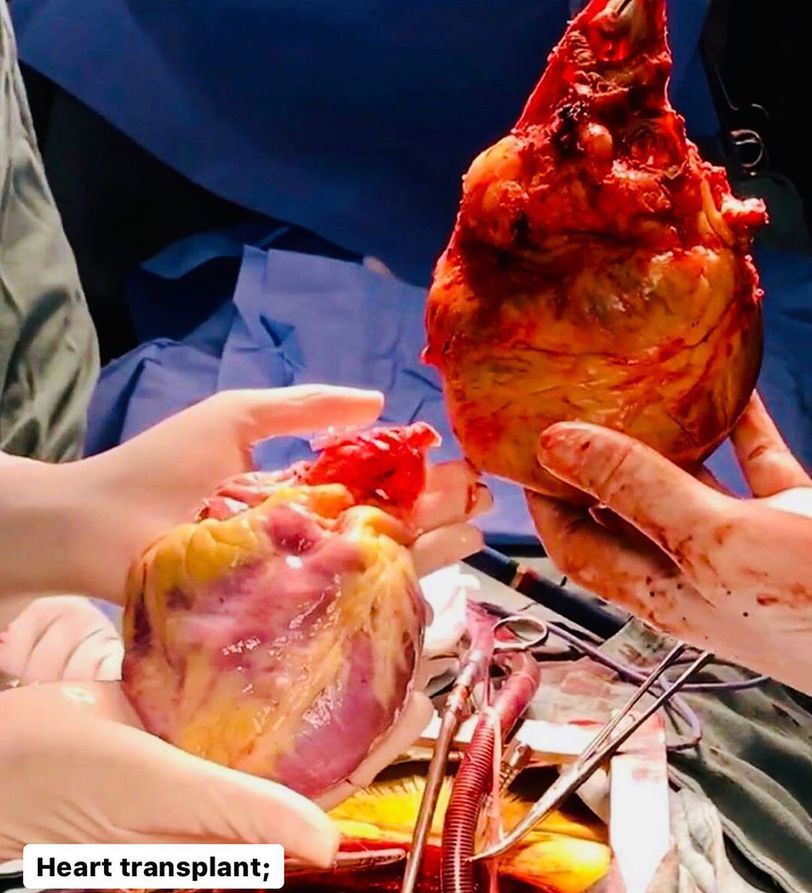 Here's a diseased heart going out and a new healthy heart going in, compared side by side. On the right is the old heart from the patient receiving a transplant. It is a diseased, dilated (Cardiomegaly) weakened heart due to a restrictive cardiomyopathy. You can see how enlarged and boggy it appears compared to the healthy donor heart on the left.