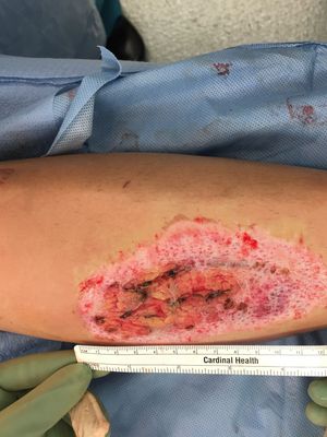 This is actually my leg. Curling iron touching hair spray can exploded and caught pants on fire causing 3rd degree burn. Treatment included 2 surgeries of skin grafting (donor site = hip).