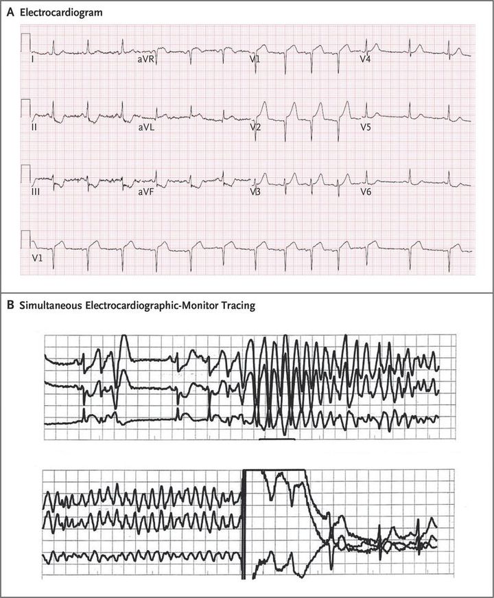 A 56-year-old man presented to the emergency department after 1 hour of sudden-onset chest pain. The initial 12-lead electrocardiogram showed ST-segment elevation and peaked T waves in the anteroseptal leads, which led to concern about acute myocardial infarction (Panel A). Emergency cardiac catheterization revealed an acute occlusion in the proximal left anterior descending artery. A drug-eluting stent was placed, restoring blood flow. The peak creatine kinase level was 4976 U per liter, with an MB index of 5.9%. The peak troponin I level was 115 ng per milliliter. According to our usual practice, routine left ventriculography was performed after stent placement, which showed moderate systolic dysfunction with anterior-wall hypokinesis of the left ventricle; during the procedure, ventricular fibrillation occurred (Panel B, top; see video). The patient's arrhythmia was successfully treated with immediate defibrillation (Panel B, bottom). Short runs of nonsustained ventricular tachycardia are common during left ventriculography (related to the catheter or contrast agent) but infrequently lead to ventricular fibrillation. The patient had no further clinically significant arrhythmias during his hospitalization.