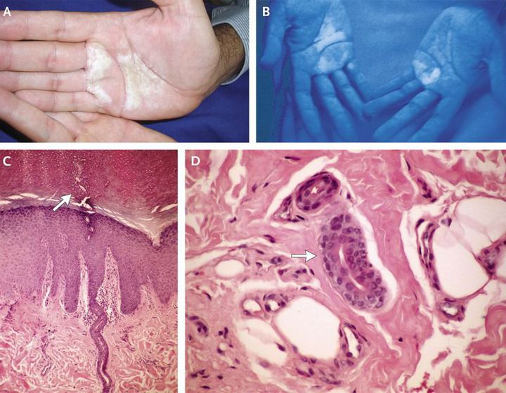 A 44-year-old otherwise healthy man presented with thickening of his palms after their immersion in water, accompanied by burning pain, pruritus, and edema. Onset was at 37 years of age. The patient had no family history of similar skin findings and said that he did not have a history of hyperhidrosis, thyroid disease, or medication use. Physical examination after the patient held a piece of gauze soaked in water for 2 minutes revealed hypopigmented, translucent papules and plaques in both palms (Panel A). The lesions became more evident when examined with a Wood's lamp (Panel B). A skin-biopsy specimen showed orthohyperkeratosis of the stratum corneum, dilatation of intraepidermal eccrine ducts (Panel C, arrow), and hyperplasia of the eccrine sweat glands (Panel D, arrow). A sweat chloride test was normal. The patient received a diagnosis of aquagenic keratoderma, an unusual condition characterized by transitory, flat-topped papules and plaques, with hyperwrinkling and eccrine-duct prominence on the palms and fingers and, in rare cases, the soles, induced by exposure to water. Aquagenic keratoderma is more frequent in women than in men and has been associated with a heterozygous mutation in the cystic fibrosis gene. The patient was treated with subcutaneous injections of botulinum toxin, with prompt improvement of his symptoms.