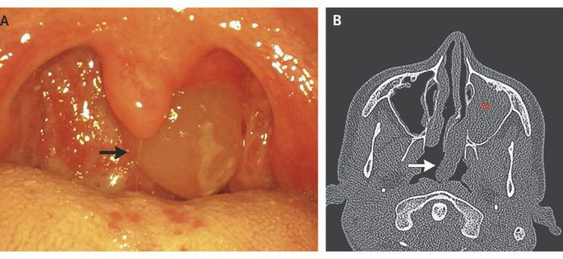 An otherwise healthy 17-year-old boy presented for evaluation of an incidentally noticed pharyngeal mass. He did not have nasal obstruction, rhinorrhea, epistaxis, or postnasal drip. Intraoral examination showed a soft, translucent, round mass occupying the left pharyngeal area (Panel A, arrow). Rhinoscopy and computed tomography of the sinuses revealed an antrochoanal polyp originating from the left maxillary sinus (Panel B, asterisk), extending through the accessory ostium into the middle meatus and then out posteriorly through the choana into the oropharynx (Panel B, arrow). The polyp was completely removed by means of endoscopic maxillary sinus surgery while the patient was under general anesthesia. The histologic diagnosis was consistent with a benign inflammatory polyp. At follow-up 6 months after surgery, there were no signs of recurrence.