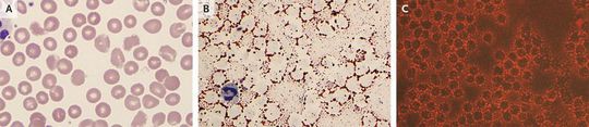 A 39-year-old woman with a history of gestational diabetes was admitted with epigastric pain from acute pancreatitis. Ultrasonography showed no gallstones or bile-duct dilatation. She had no history of hyperlipidemia, but multiple blood samples were grossly lipemic, and serum triglyceride levels were markedly increased at more than 4425 mg per deciliter (50.0 mmol per liter), as compared with a normal value of less than 200 mg per deciliter (2.3 mmol per liter). Wright's staining of a peripheral-blood smear showed numerous small lipid droplets overlying and surrounding the periphery of the red cells (Panel A). Staining with oil red O, which is commonly used to demonstrate lipid in tissue sections, was performed on the peripheral blood and highlighted the triglycerides surrounding the red cells on light microscopy (Panel B) and under fluorescence (Panel C). The patient underwent treatment for severe hypertriglyceridemia and pancreatitis. The triglyceride level decreased to 471 mg per deciliter (5.3 mmol per liter), and the peripheral blood showed a marked decrease in staining with oil red O on light microscopy and under fluorescence. The symptoms of pancreatitis resolved with treatment, and the patient was discharged home.