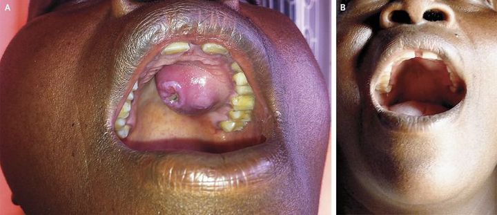 A 45-year-old woman presented to an outreach clinic in rural Uganda with a 1-year history of a progressively enlarging ulcerated mass on the hard palate (Panel A). The mass had initially been painless but more recently had become painful and was causing difficulty in speaking and swallowing. She had received a diagnosis of cancer and was attempting to sell her home to pay for surgical resection. She had no history of syphilitic symptoms or treatment. The results on Treponema pallidum hemagglutination assay were positive for syphilis; nontreponemal testing was not locally available. Serologic analysis for human immunodeficiency virus was negative. Tertiary syphilis with an oral gumma was diagnosed. The patient was treated with three intramuscular injections of 2.4 million units of penicillin G benzathine at 1-week intervals. At follow-up 2 months after the end of treatment, there was resolution of the mass and symptoms (Panel B). In the oral cavity, gummas may occur as masses on the hard palate or tongue that frequently ulcerate.