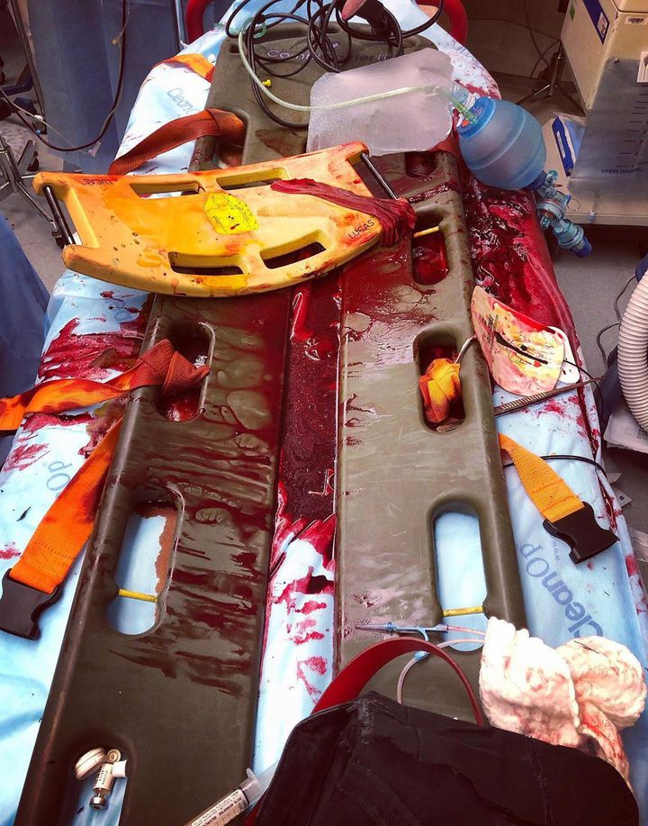 Patient arrived in cardiac arrest. He underwent emergency room thoracotomy after having over 2000 cc coming out of his chest tube, indicating an ongoing massive hemorrhage. He was then taken to the operating room. The patient survived, but anoxic brain injury occurred resulting in brain death. The patient was then placed for organ harvest. The liver and kidneys were donated saving 3 lives. Thoracotomies are considered last ditch efforts due to the fact that patients do not end up surviving, even with this aggressive intervention. An incision is made on the left lateral chest, exposing the 4th and 5th ribs. The pectoralis muscles and intercostal muscles are cut and the ribs are retracted, exposing the heart. With the heart exposed, the surgeon is able to quickly suture up any lacerations of the heart or major vessel and manually pump the heart (aka an open cardiac massage). Photo by @dr.nirhus