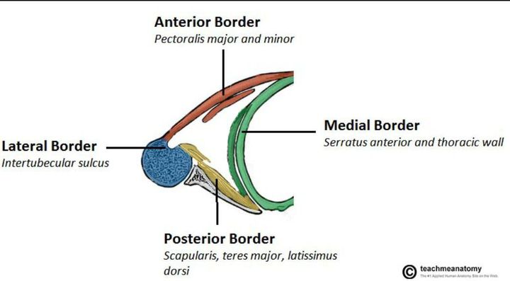 Anterior: Pectoralis major Pectoralis minor Posterior: Subscapularis Teres major Latissimus dorsi Medial : Serratus anterior and thoracic wall Lateral: Intertubercular sulcus /bicipital groove NOTE :STUDENTS OFTEN CONFUSE TERES MINOR INSTEAD OF TERES MAJOR IN THE POSTERIOR WALL OF AXILLA(VISUAL LEARNERS MAY GET IT RIGHT đ)