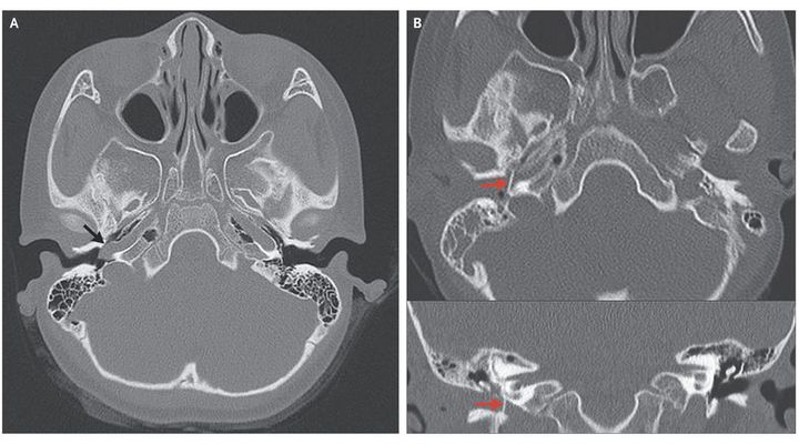A 6-year-old girl presented with a 1-year history of pulsatile tinnitus in her right ear. Pure-tone audiometry showed normal hearing. Otoscopy showed a whitish pulsatile mass behind the tympanic membrane in the anteroinferior quadrant of the middle-ear cavity (see video). Computed tomography (CT) of the temporal bone revealed a vessel coursing through the hypotympanum (Panel A, arrow) and entering the carotid canal through a dehiscence in the carotid plate — a finding consistent with an aberrant right internal carotid artery. Normal structures in the left ear are shown for comparison, including the normal location of the internal carotid artery at this level within the carotid canal and an intact carotid plate. An aberrant internal carotid artery in the middle ear is a rare vascular anomaly. It is essentially a collateral pathway that traverses the middle ear, involving the communication of an enlarged inferior tympanic artery with an enlarged caroticotympanic artery, and can occur when the cervical internal carotid artery is underdeveloped or has regressed during embryogenesis. An aberrant internal carotid artery can mimic other middle-ear lesions, so it is important that imaging be performed before any surgical intervention in order to avoid bleeding complications that may result from misdiagnosis. The patient underwent surgical correction (Panel B, arrows; the upper panel shows an axial CT scan, and the lower panel a coronal CT scan). At 13 months of follow-up, otoscopy showed a healthy tympanic drum, and the patient reported no remaining symptoms.