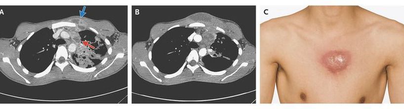 A previously healthy 18-year-old man was admitted to the hospital with a 3-month history of coughing, expectoration of reddish sputum, weight loss, and fever; a small region of swelling had developed on his anterior chest wall in the preceding week. A computed tomographic (CT) scan of the chest obtained on admission showed a collar-button abscess (a subcutaneous abscess connected to a deeper abscess by a passage), consisting of an abscess in a lymph node in the left mediastinum (Panel A, red arrow) connected to a subcutaneous abscess in the anterior chest wall (Panel A, blue arrow). CT also revealed an extensive parenchymal abnormality in the left upper lobe. A sputum smear showed acid-fast bacteria, and a culture grew pansusceptible Mycobacterium tuberculosis. Tests for human immunodeficiency virus were negative. The patient received 8 weeks of standard antituberculous treatment, but the infection progressed, with increased swelling, erythema, and fluctuation of the subcutaneous abscess (Panels B and C). The abscess was subsequently treated with open drainage. Pharmacologic treatment of a tuberculous abscess is seldom sufficient, and open drainage or surgical excision is often required. The patient has been without signs of relapse since surgery but required plastic surgery to improve the cosmetic result after drainage.