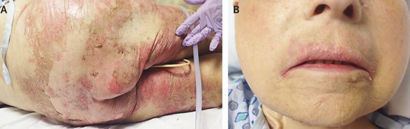 A 54-year-old woman presented with a 4-month history of intractable rash that was not responsive to topical glucocorticoid and antifungal treatment. She had undergone bariatric surgery with Roux-en-Y gastric bypass about 8 years previously. She reported that during the preceding few months, she had stopped taking her multivitamins and had not been eating much because of a lack of appetite and financial difficulties. On examination, an erythematous, desquamating rash associated with excoriations and honey-colored crusting was noted. The rash was predominant over the lumbosacral region (Panel A), the perioral region (Panel B), and the inguinal region, as well as on her forearms and hands in association with palmar erythema and fissuring. Skin biopsy revealed nonspecific histologic findings of parakeratosis, impetiginized regions, and chronic inflammation with dermal edema. A workup for infectious and autoimmune conditions was not revealing. An evaluation for micronutrient deficiencies caused by malabsorptive bariatric surgery and poor nutritional intake revealed a plasma zinc level of 0.31 μg per milliliter (4.7 μmol per liter) (normal range, 0.55 to 1.50 μg per milliliter [8.4 to 23.0 μmol per liter]). Acquired acrodermatitis was diagnosed, and the patient began a regimen of zinc supplementation. Nearly complete resolution of the rash was noted at follow-up 4 weeks later.