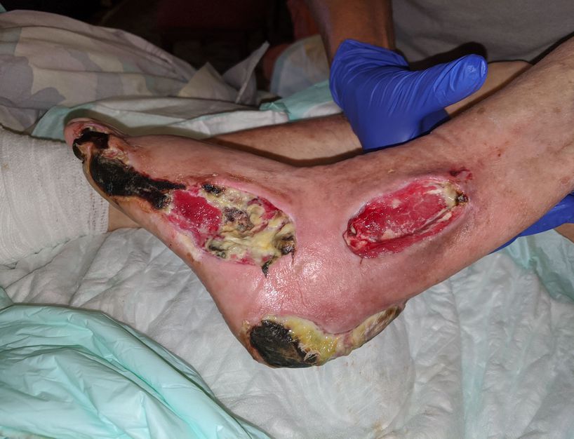 94 yr old woman who is bed bound. 1x a week debridement to left foot in order to prevent sepsis(not intended for healing purposes in this case). Mild odor to wound since the start of debridement. Treatment also includes santyl wound gel to all black eschar areas, Dawkins solution(odor prevention) soaked gauze and Maxorb to open areas. Dry dressing wrap, daily.